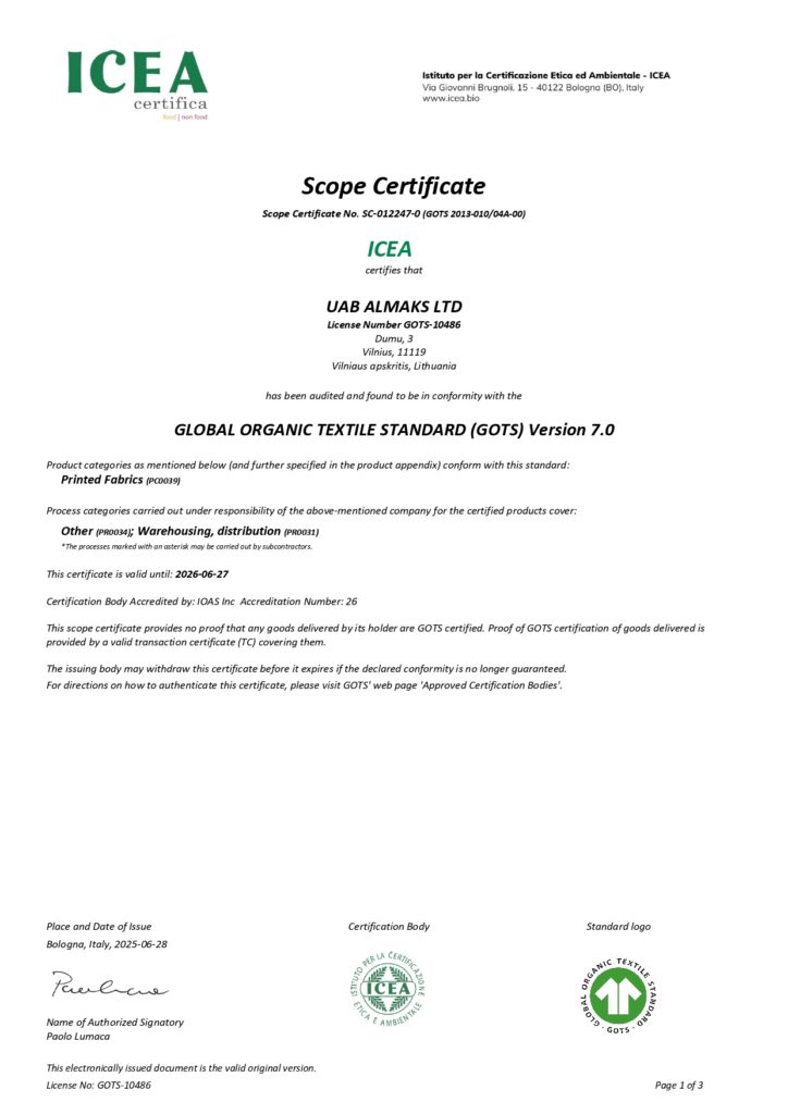 UAB “Almaks” has been working for you since 2002. Many years of experience in working with fabrics have taught us to combine technologies and naturalness to achieve the highest quality standards. We produce printed, solid-coloured and striped knitted fabrics, exclusive jacquard fabrics, sportswear fabrics for your various needs. We perform high-quality certified printing of woven and knitted fabrics. All our fabrics are certified with global “Oeko-Tex” or “GOTS” organic fabric quality certificates. Our team is always ready to listen to your needs and offer the most suitable solutions.